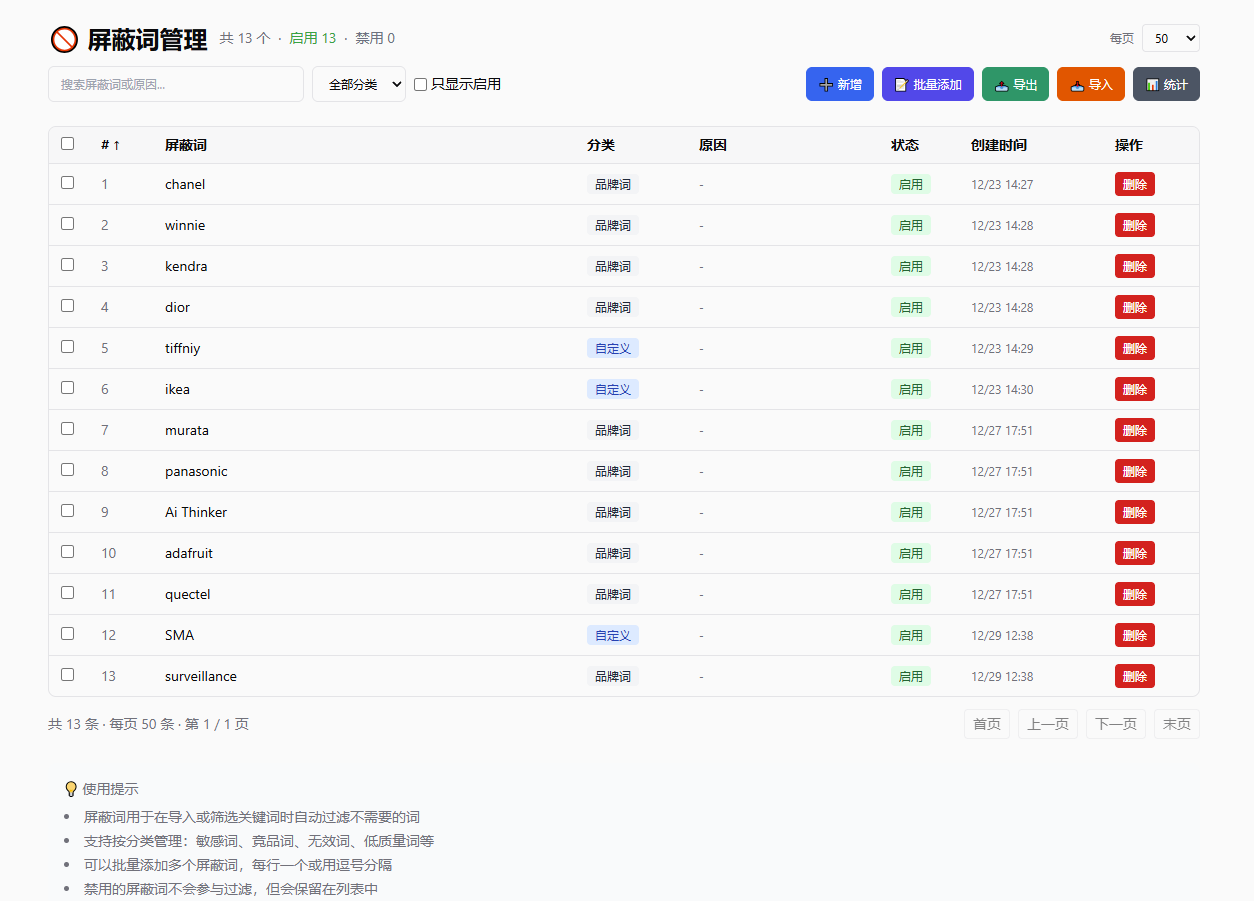 2026年01月14日 admin 屏蔽词管理 阿里国际站屏蔽词管理为了不侵权, 需要屏蔽一些品牌词,侵权词. 这里就是统一管理这些内容. 只要增加了屏蔽词, 在发布产品时, 生成关键词中, 如果包含了屏蔽词,则会自动删除屏蔽词.一. 增加屏蔽词. 二. 管理屏蔽词.