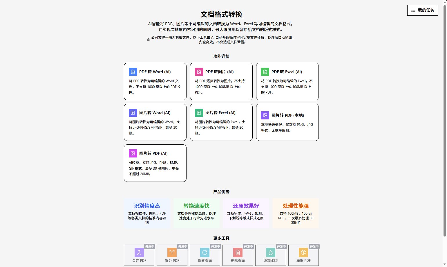 公司文件一般为机密文件,以下工具由 AI 自动开辟临时空间实现文件转换,处理后自动销毁,安全高效,不会造成文件泄露。
